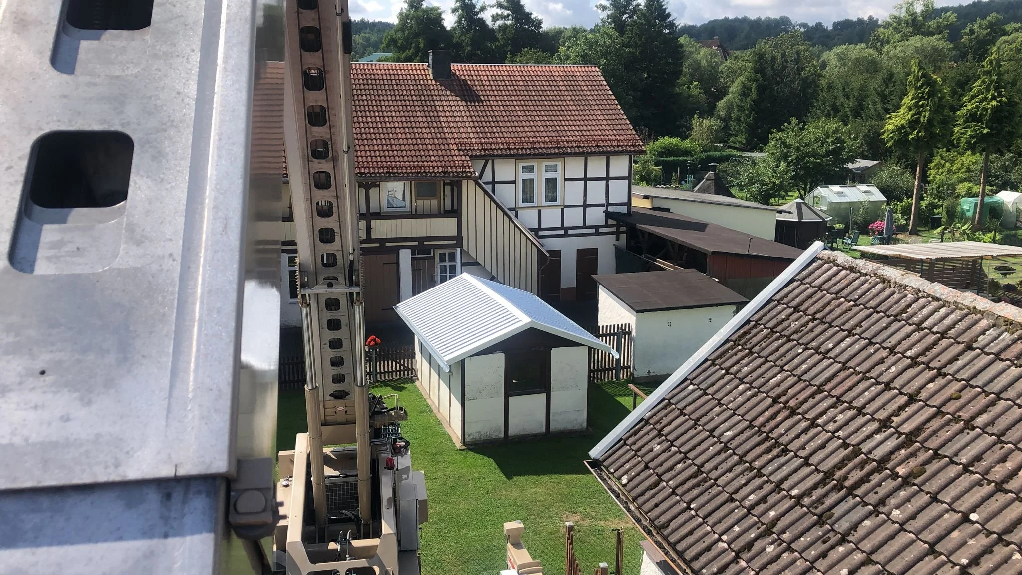 Blick von unserer Hebebühne bei einer Dachrinnenerneuerung nebenan.