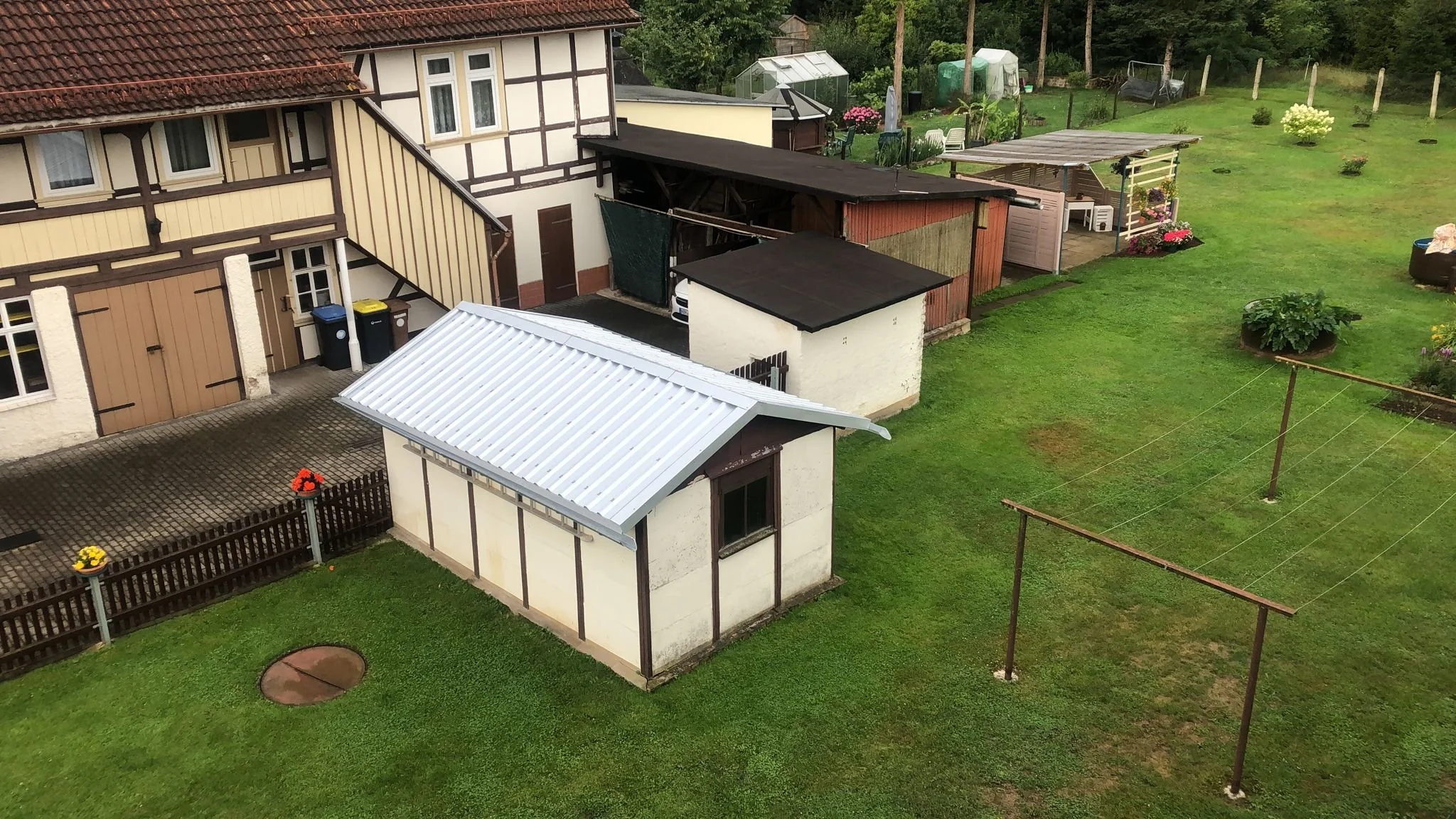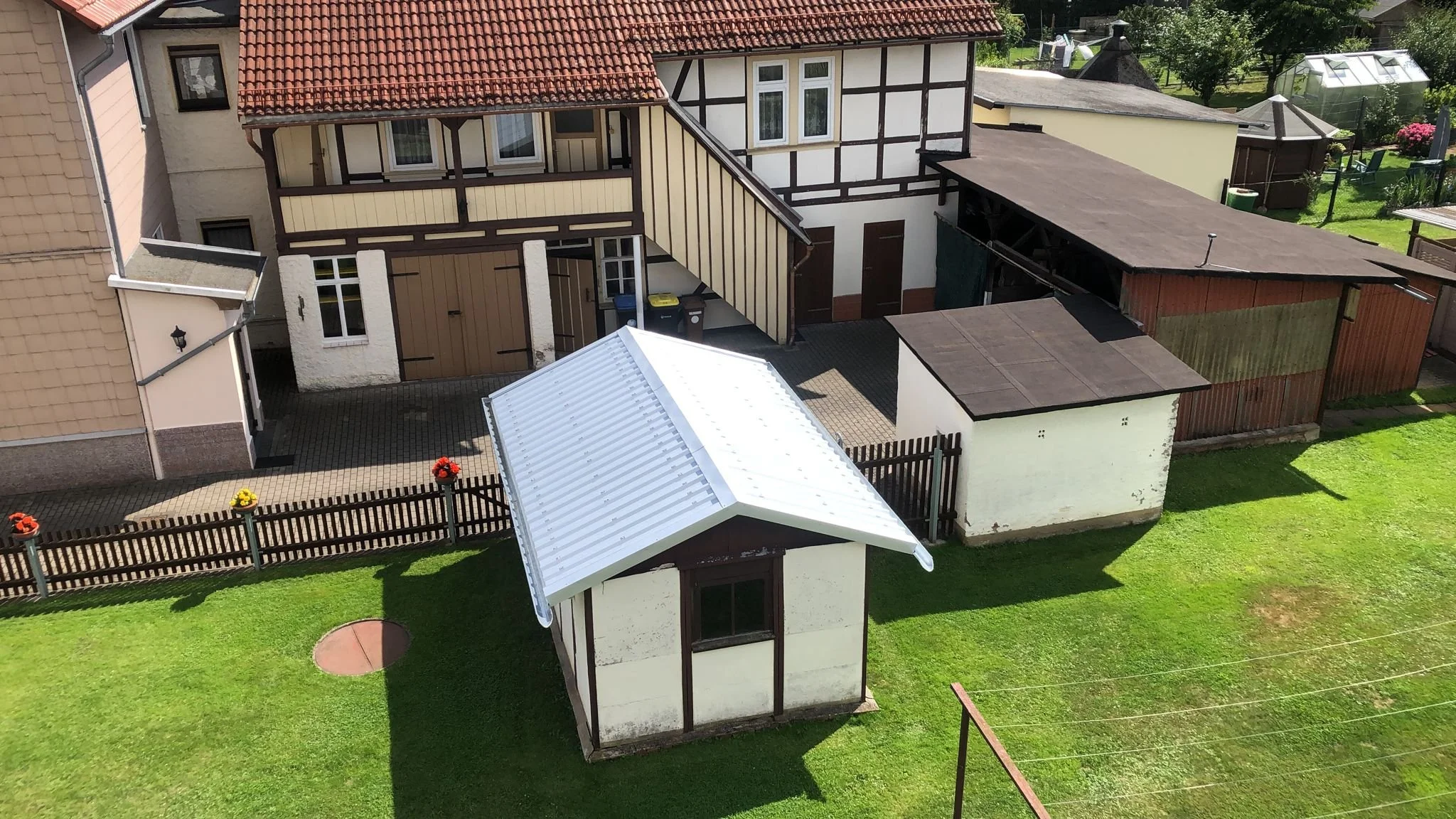 Ein weiteres kleines Dach mit Trapezblechen in Ellrich. Wir kümmerten uns schnell darum, damit keine weitere Feuchtigkeit in das solide Gartenhaus in Ellrich gelangt.