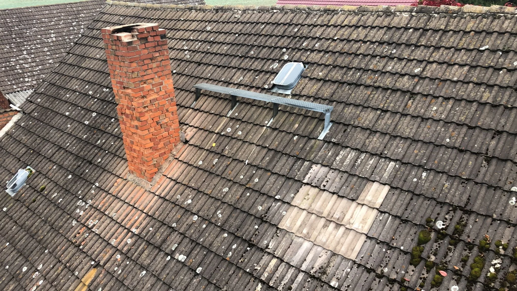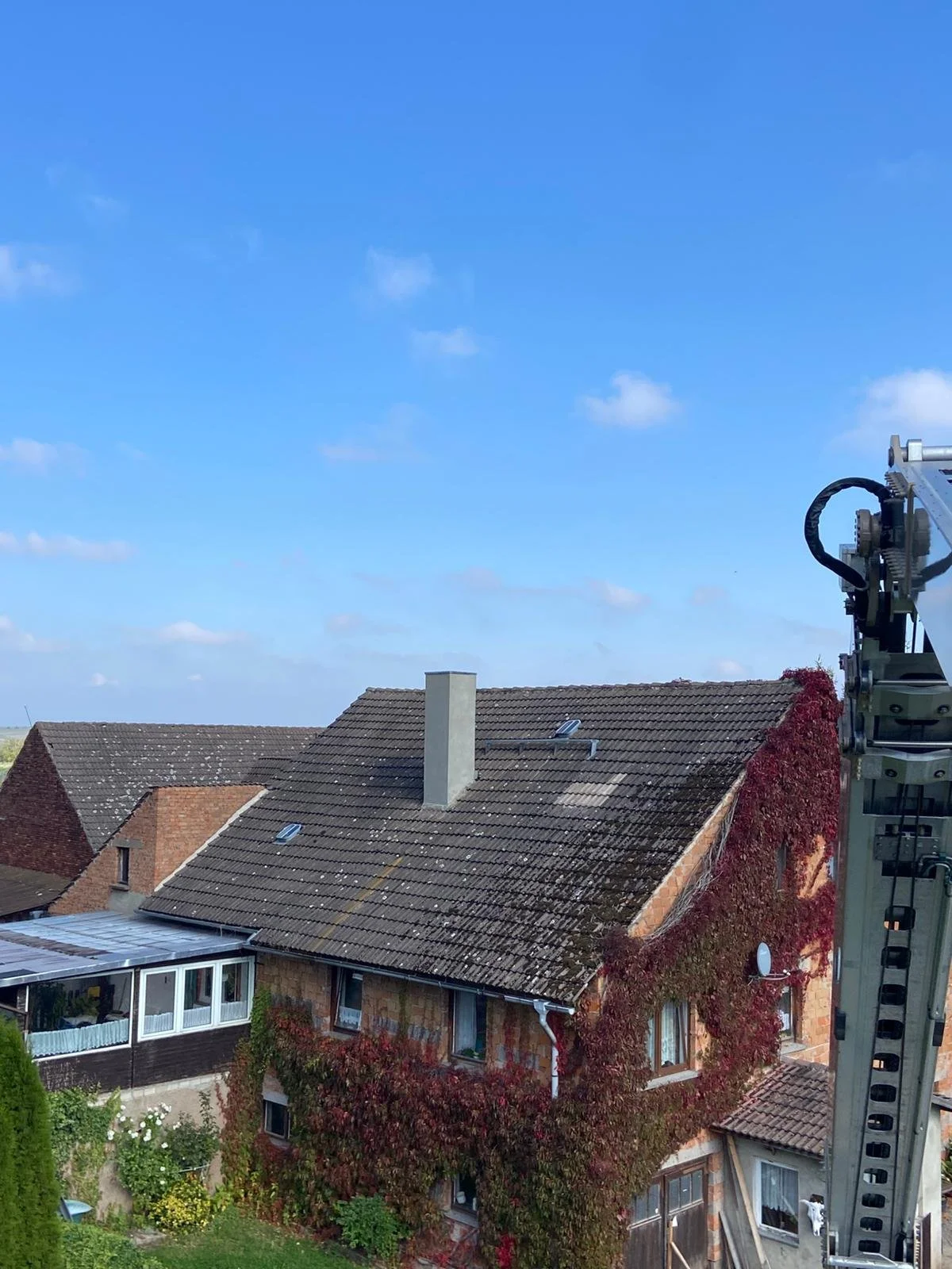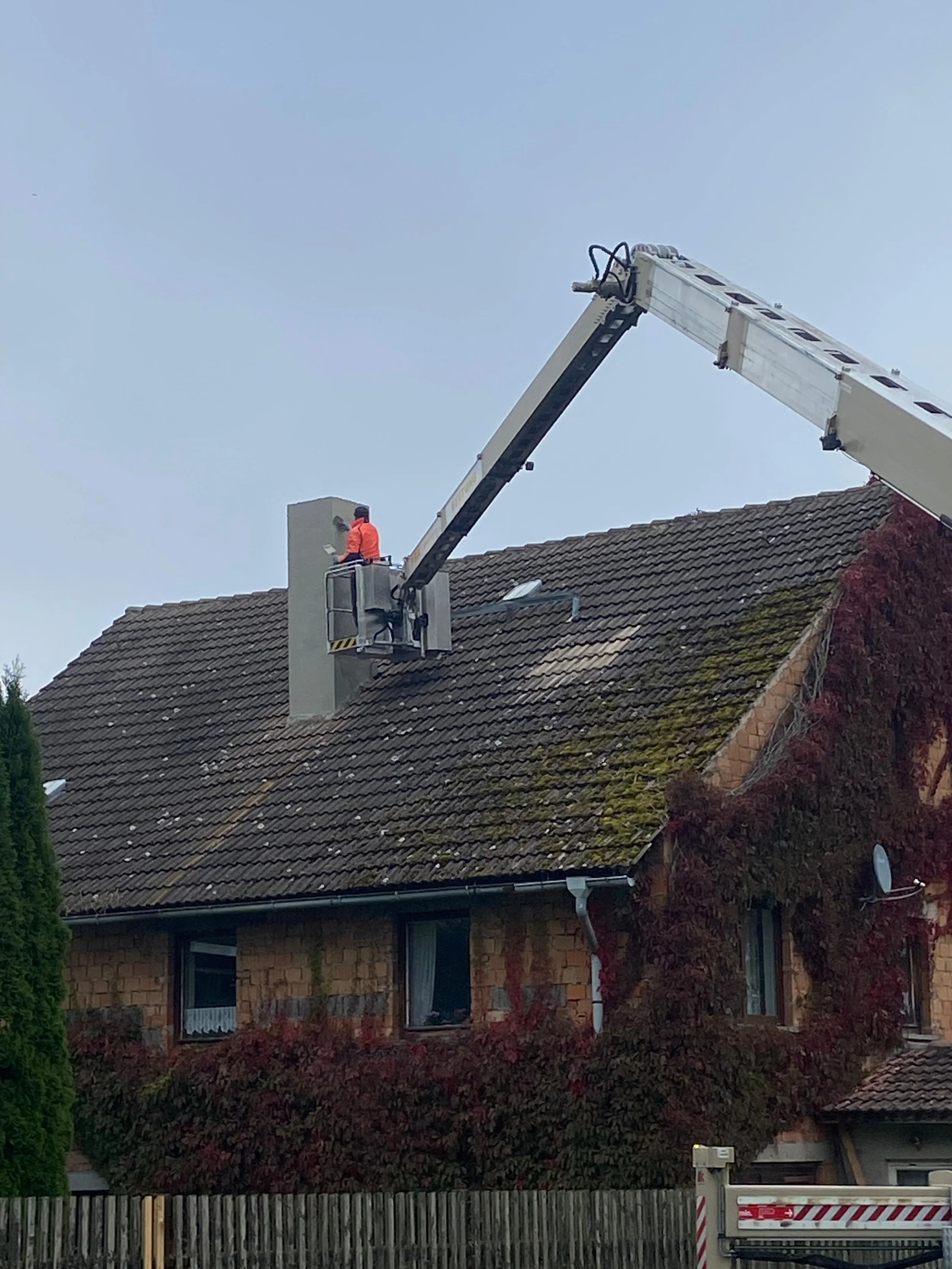 Das Mauerwerk des Schornsteins war stark beschädigt und wir sicherten zunächst lose Steine die sich immer weiter lösten. Der Schornsteinkopf wurde durch unserern Maurer instandgesetzt und wieder sicher aufgebaut. Die Kehle zum Dach wurde überprüft, sodass ein Wassereinbruch am Schornstein weiterhin verhindert wird.